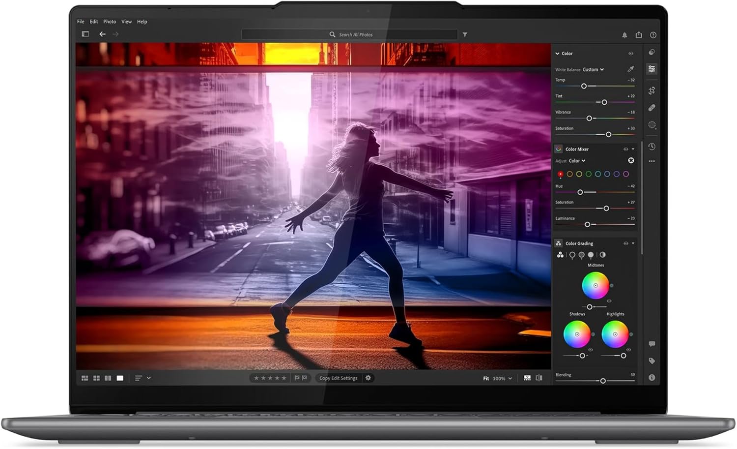 El Lenovo Yoga Slim 7 Gen 9 14IMH9 es un portátil premium de 14″ pensado para creativos y profesionales que buscan ligereza, potencia e inteligencia artificial integrada. Su pantalla OLED WUXGA de 14 pulgadas (1920 × 1200) ofrece negros profundos, alto contraste y una gran fidelidad de color, ideal para edición de foto y vídeo, diseño y consumo multimedia.